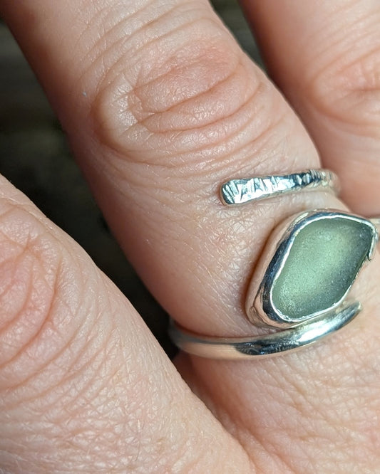 Adjustable sea foam sea glass ring with half hammered round band