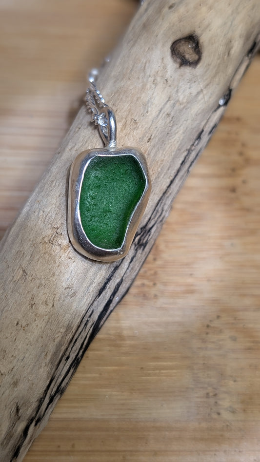 Green sea glass pendant encased in bezel with chain